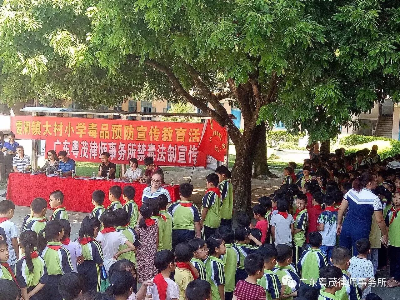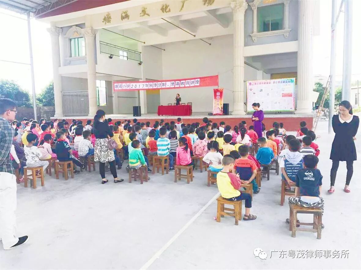 中小学开学后,村(社区)律师第一时间到学校宣传《未成年人保护法》、《预防未成年人犯罪法》、《中华人民共和国义务教育法》等相关法律法规进一步预防未成年人犯罪,并增强自我保护意识。另,广东粤茂律师事务所党支部牵头组织到校园开展禁毒主题活动,获得镇干部群众及学校师生一致高度评价:如2017年9月12日来到霞洞镇大村小学派发禁毒宣传资料,张展律师以真实的案例,通俗易懂的语言,就校园禁毒问题为学校师生上了一场别开生面的法制课,现场气氛热烈;9月19日来到罗坑镇中心小学,张学清律师为中心小学近十个班级学生讲授了禁毒法制课,等等。