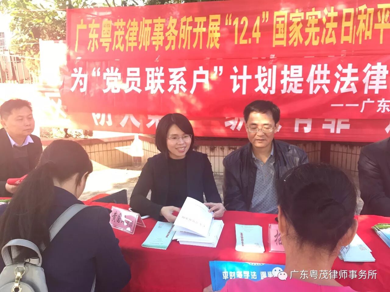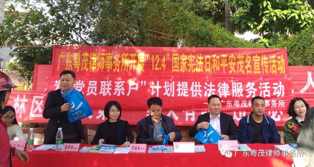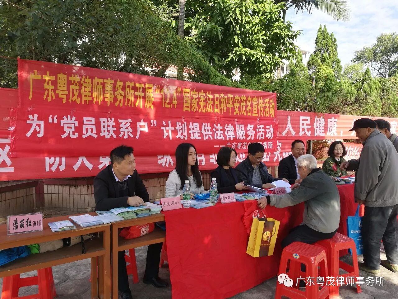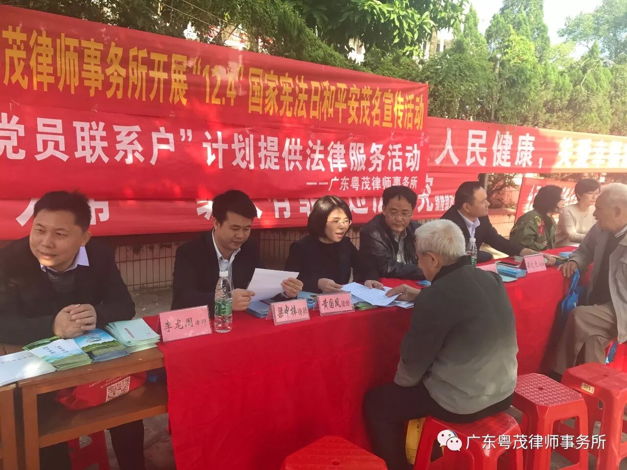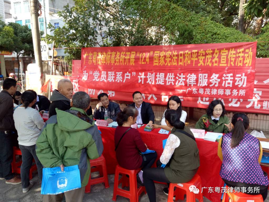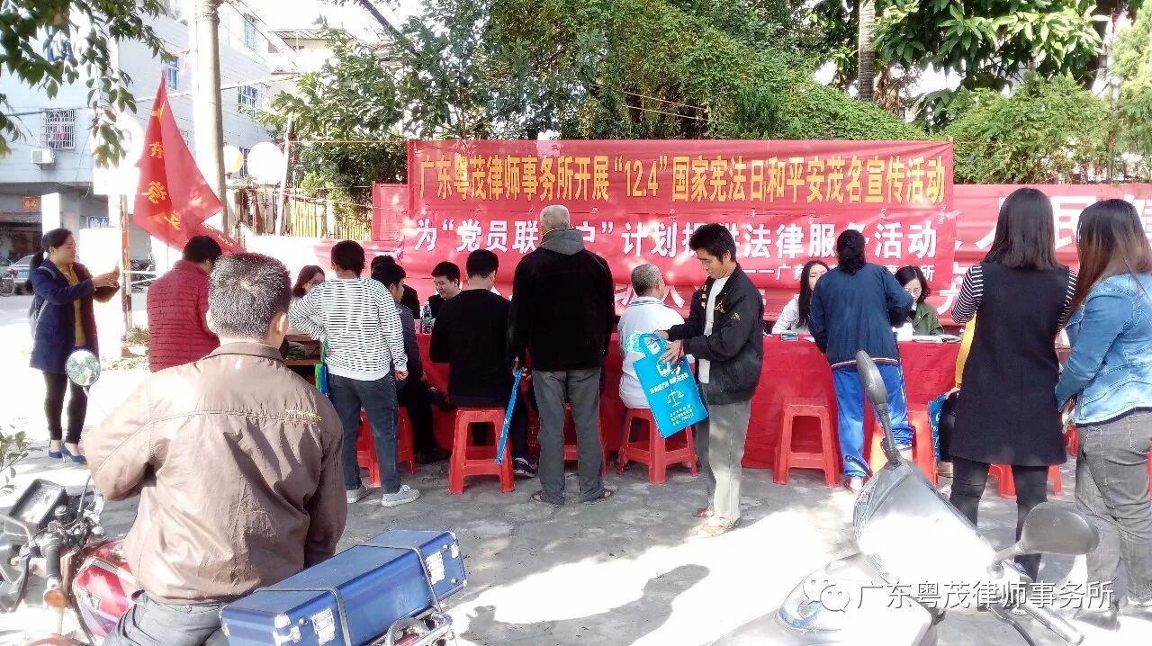 12月4日系我国第四个国家宪法日,为进一步弘扬宪法精神,维护宪法权威,保证宪法实施,推进法治中国建设,教育引导全体公民树立宪法意识、增强宪法观念,自觉履行维护宪法尊严,同时结合为“党员联系户”计划提供法律服务的工作要求,2017年12月1日,广东粤茂律师事务所联合信宜市镇隆镇政府、司法所,在镇隆镇开展大型普法宣传活动。